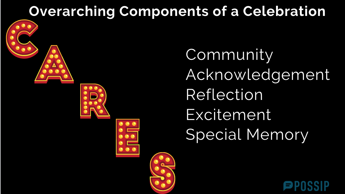 Every celebration must have five components. Keep CARES in mind when planning creative milestone celebrations so that you have a framework to begin thinking about putting your event together. Here’s what it stands for: